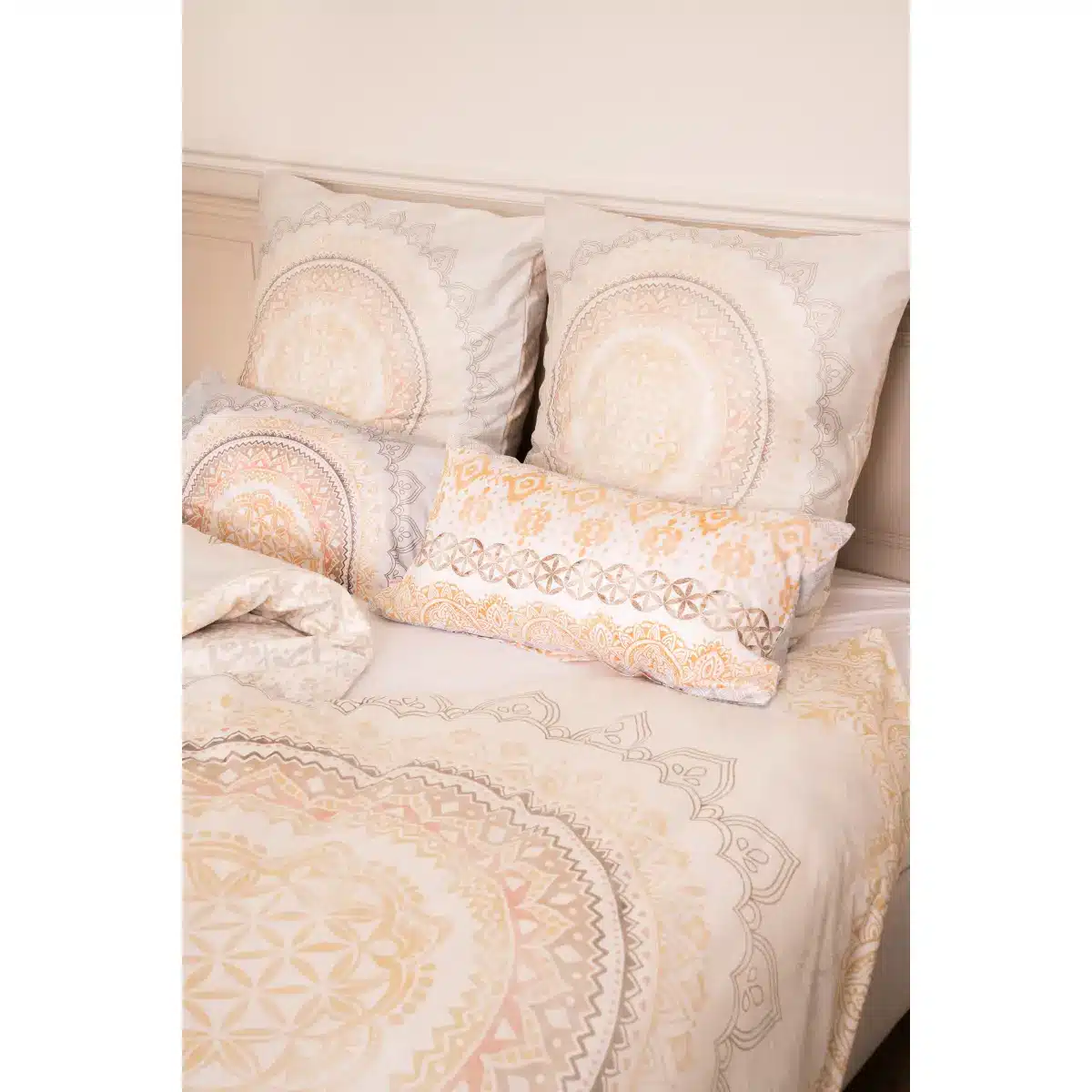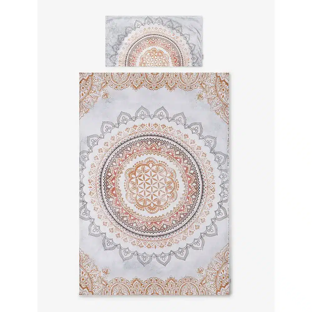 Besonders kraftvoll ist die Kombination aus Design und feiner Symbolik: Das kunstvoll gestaltete Mandala trägt die Schwingung der Blume des Lebens, einem traditionellen Zeichen für Ausgewogenheit und Klarheit. Ergänzt wird dieses Muster durch mikrofein eingearbeiteten Rosenquarz – ein Edelstein, der dem Herzbereich zugeordnet ist und Dir ein Gefühl von Vertrauen, Geborgenheit und innerer Balance schenken kann. Wenn Du es lieber etwas ruhiger magst, lässt sich die Bettwäsche einfach wenden. Die Rückseite zeigt einen sanften, ethno-inspirierten Allover-Print, der eine dezente und erdende Wirkung entfaltet.