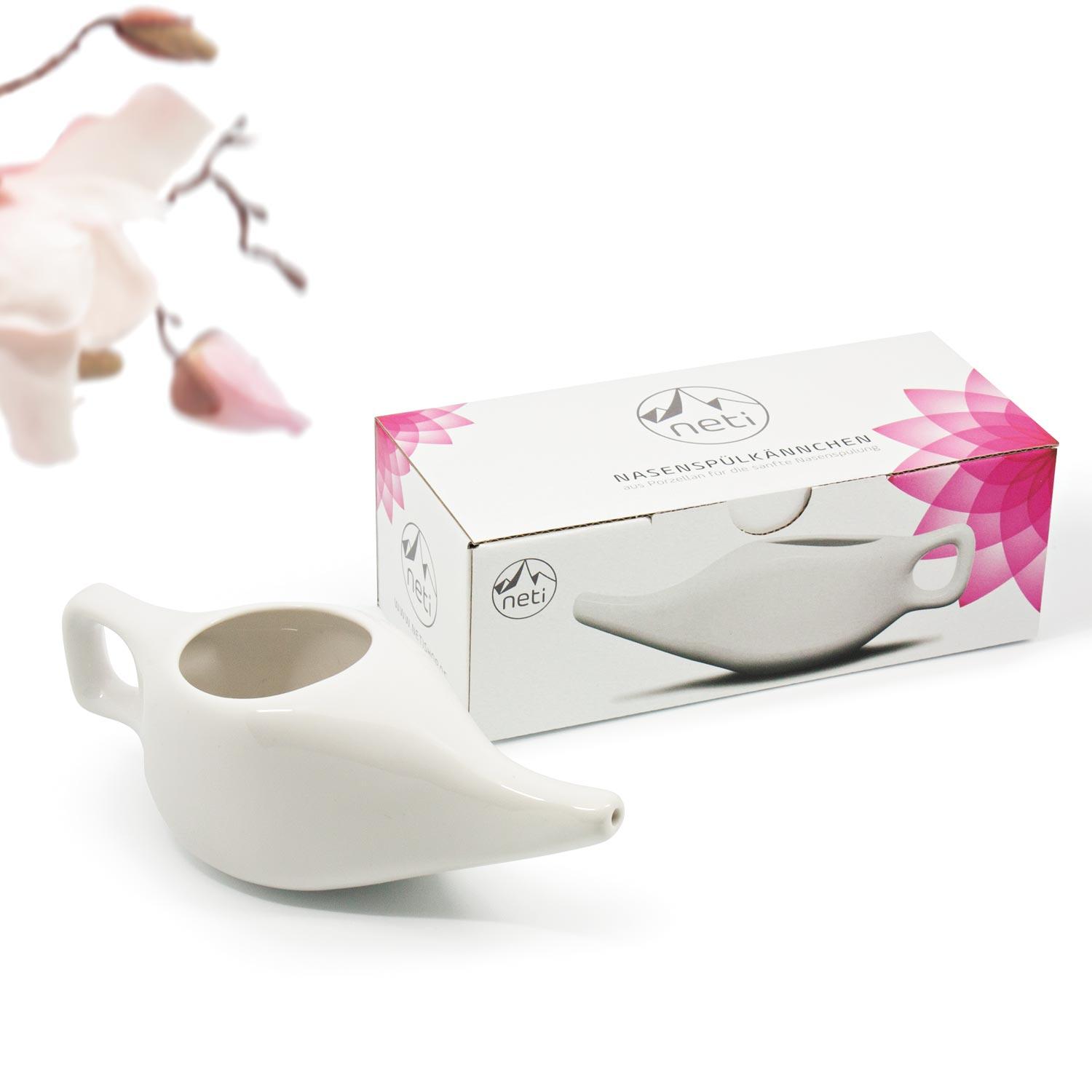 Das Neti-Kännchen wird in Deutschland aus hochwertigem, ebenmäßig verarbeitetem Porzellan gefertigt. Es ist besonders hygienisch, langlebig und spülmaschinenfest. Die glatte Oberfläche sorgt für eine angenehme Anwendung und einfache Reinigung. Mit einem Fassungsvermögen von ca. 125 ml bietet es die ideale Größe für eine effektive Nasenspülung. Eine ausführliche Gebrauchsanweisung liegt bei.