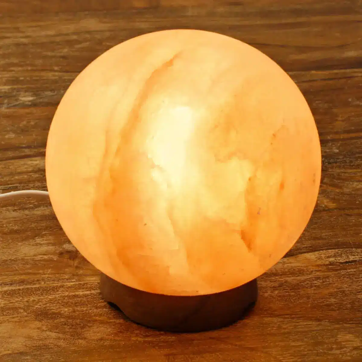 Diese Salzlampe hat einen Durchmesser von etwa 15 cm, wiegt rund 4,5 kg und steht auf einem runden Sockel aus Holz. Sie besteht aus echtem Salzkristall, der in der Salt Range im pakistanischen Teil der Himalaya-Region gewonnen wird. Die Farbe reicht von zartem Rosé bis zu kräftigem Orange und verleiht jedem Raum eine warme, wohnliche Note.