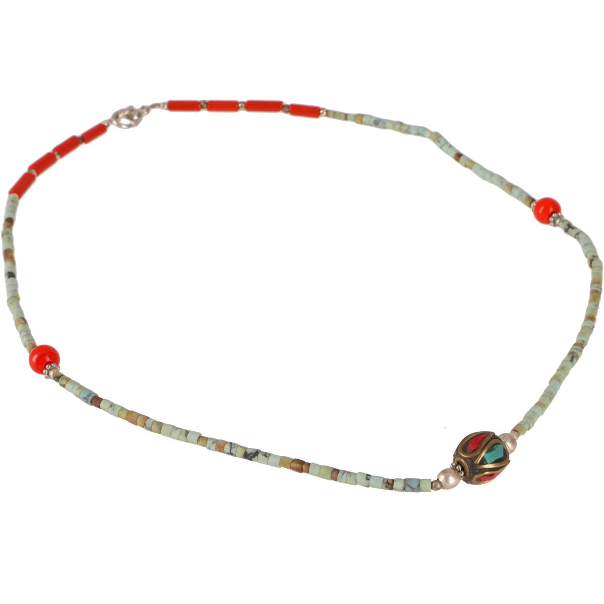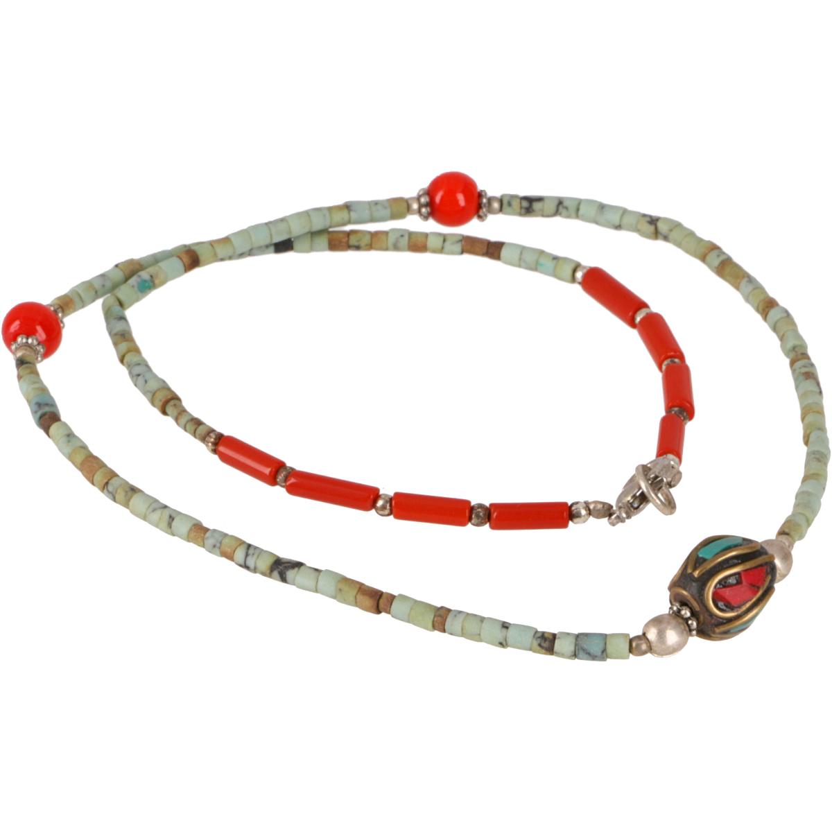 Die tibetische Halskette aus Halbedelsteinen überzeugt mit filigranem Design und harmonischen Farben. Die zarten Perlen aus Türkis und Koralle harmonieren perfekt mit den feinen Metallakzenten und sind einfach zum Verlieben!